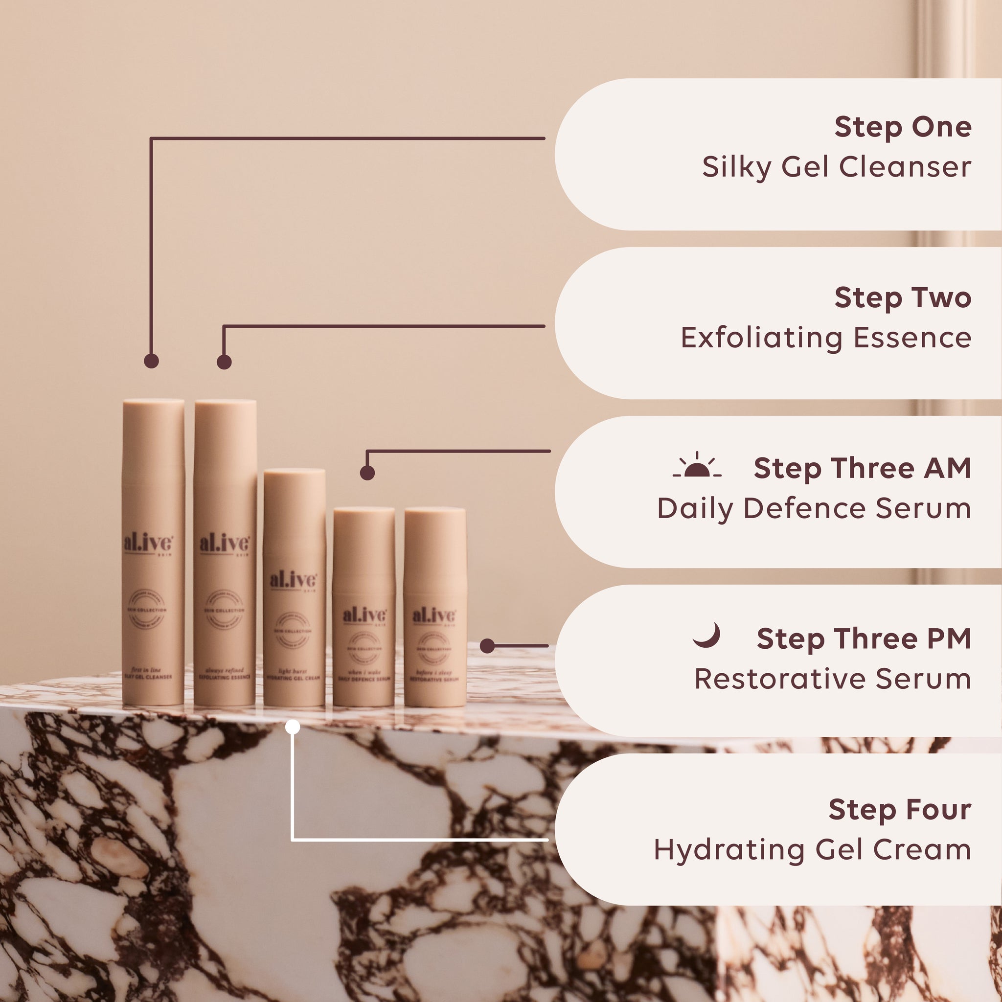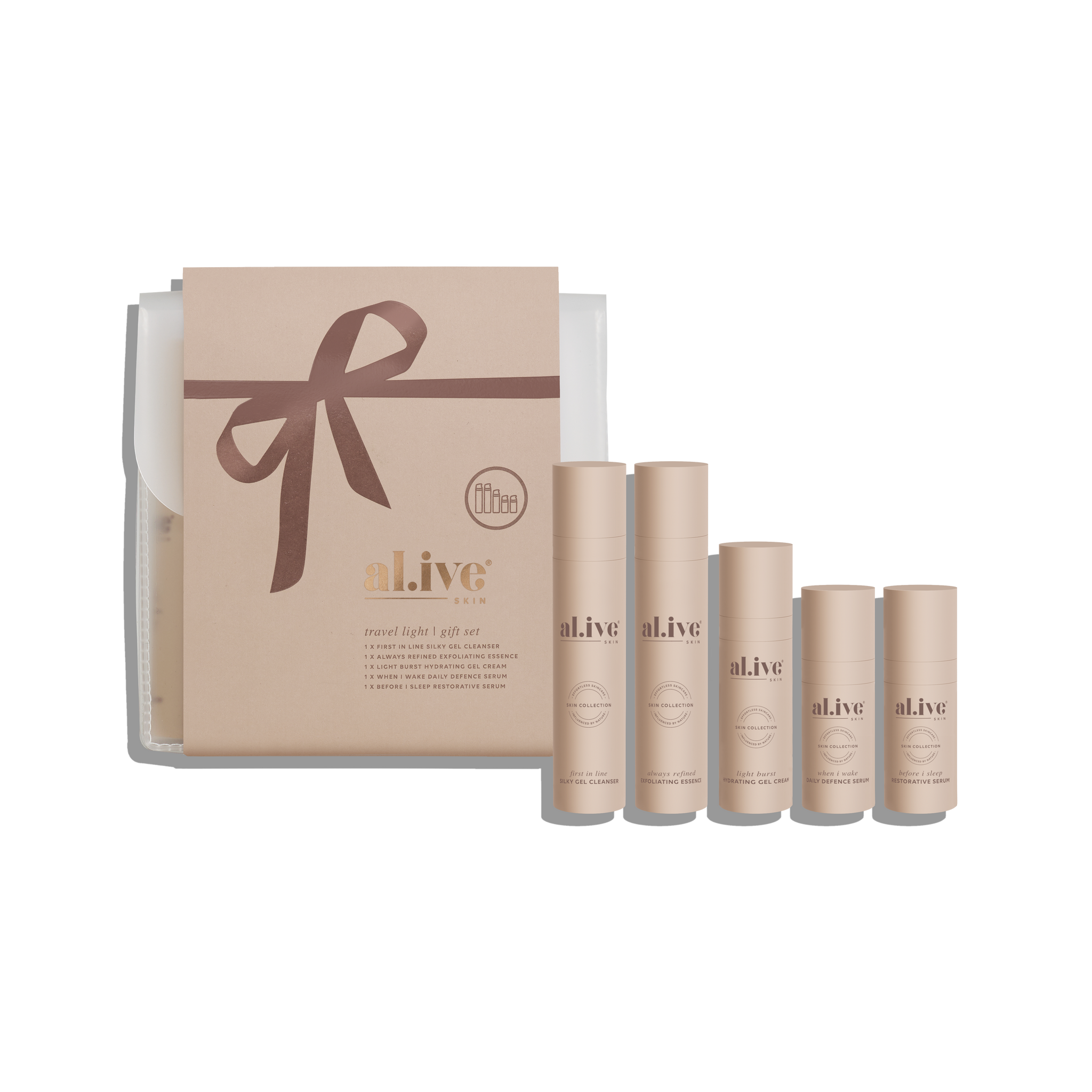Experience the complete al.ive skin ritual with the five-piece Travel Light Gift Set, featuring our bestselling formulations in travel-friendly sizes. Designed to hydrate, revitalise and protect, it’s perfect for discovering your new ritual or maintaining your glow on holiday travels.