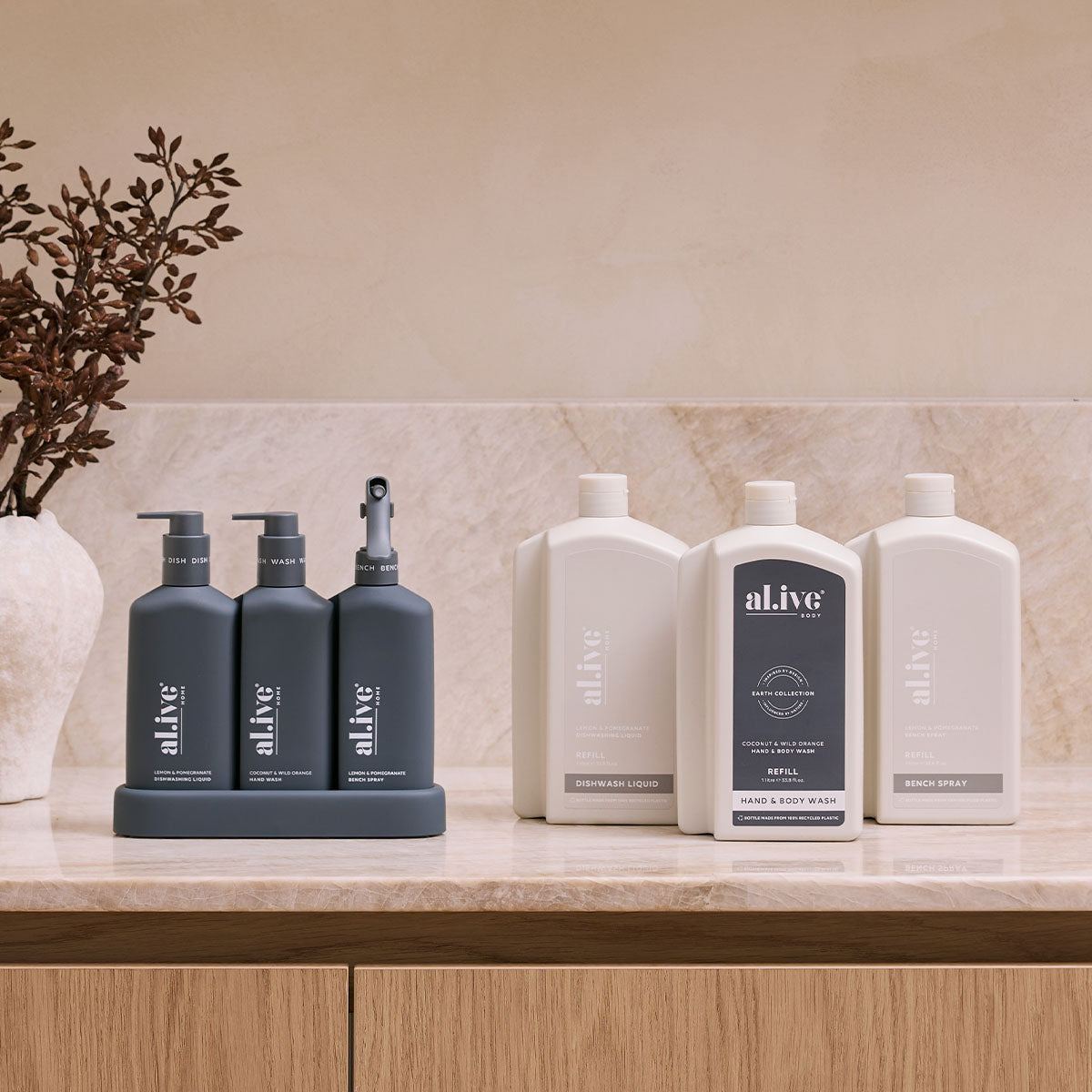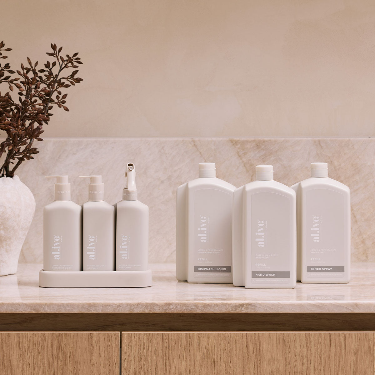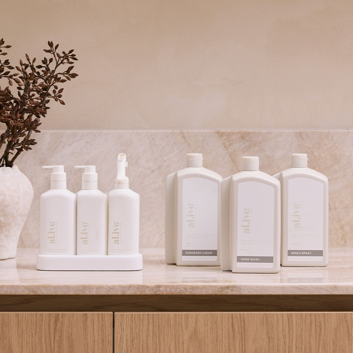 The Kitchen Trio & Refill Bundle offers a sustainable way to get the complete kitchen experience with your choice of Kitchen Trio paired with any three 1L refill bottles in two scents and colourways, perfect for refreshing your Kitchen Trio.