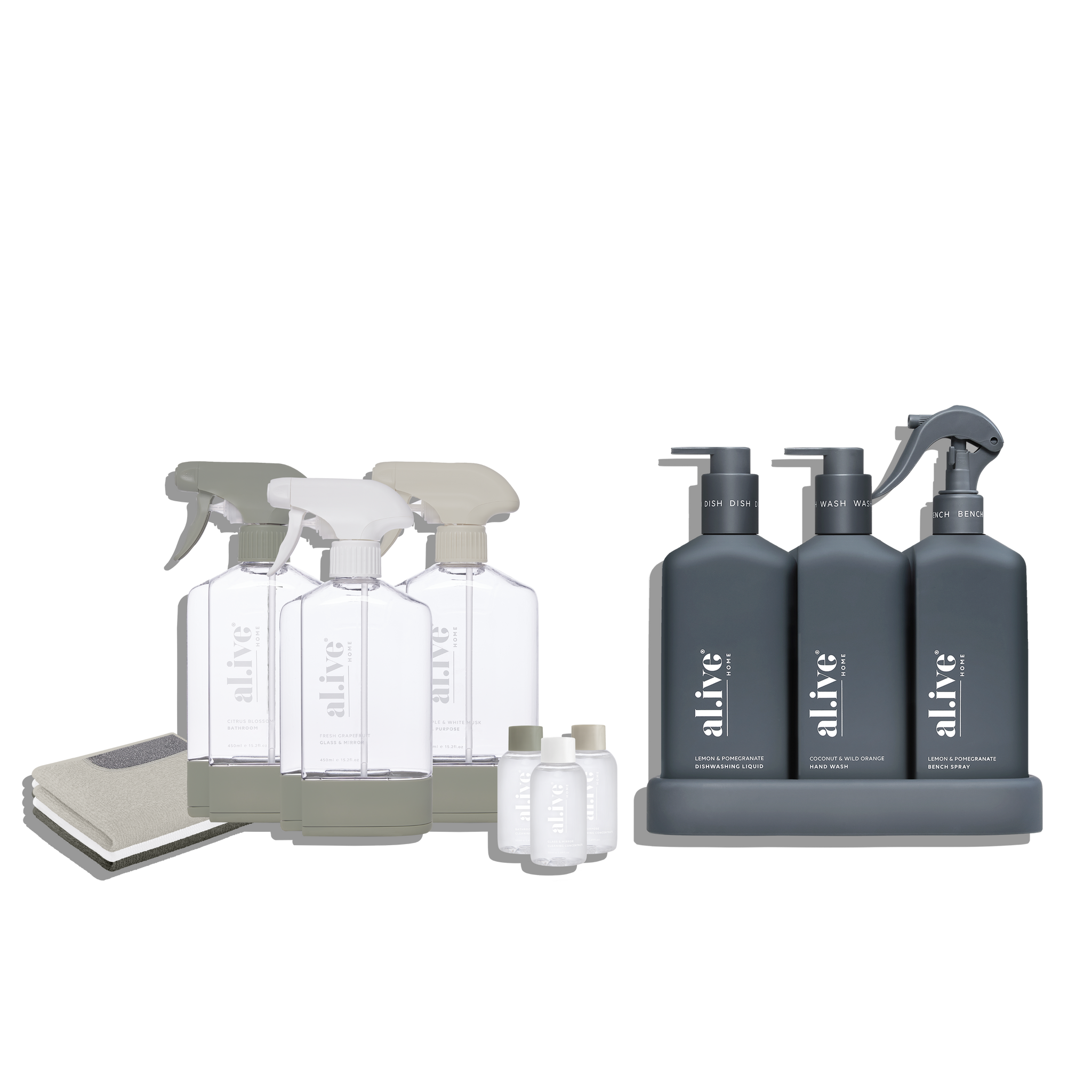 Pair the cleaning kit with a Kitchen Duo or Trio, available in both scents and colours. You can select a duo or trio based on the size of your space and personal preference for products, creating a cohesive and elevated look on your kitchen bench.