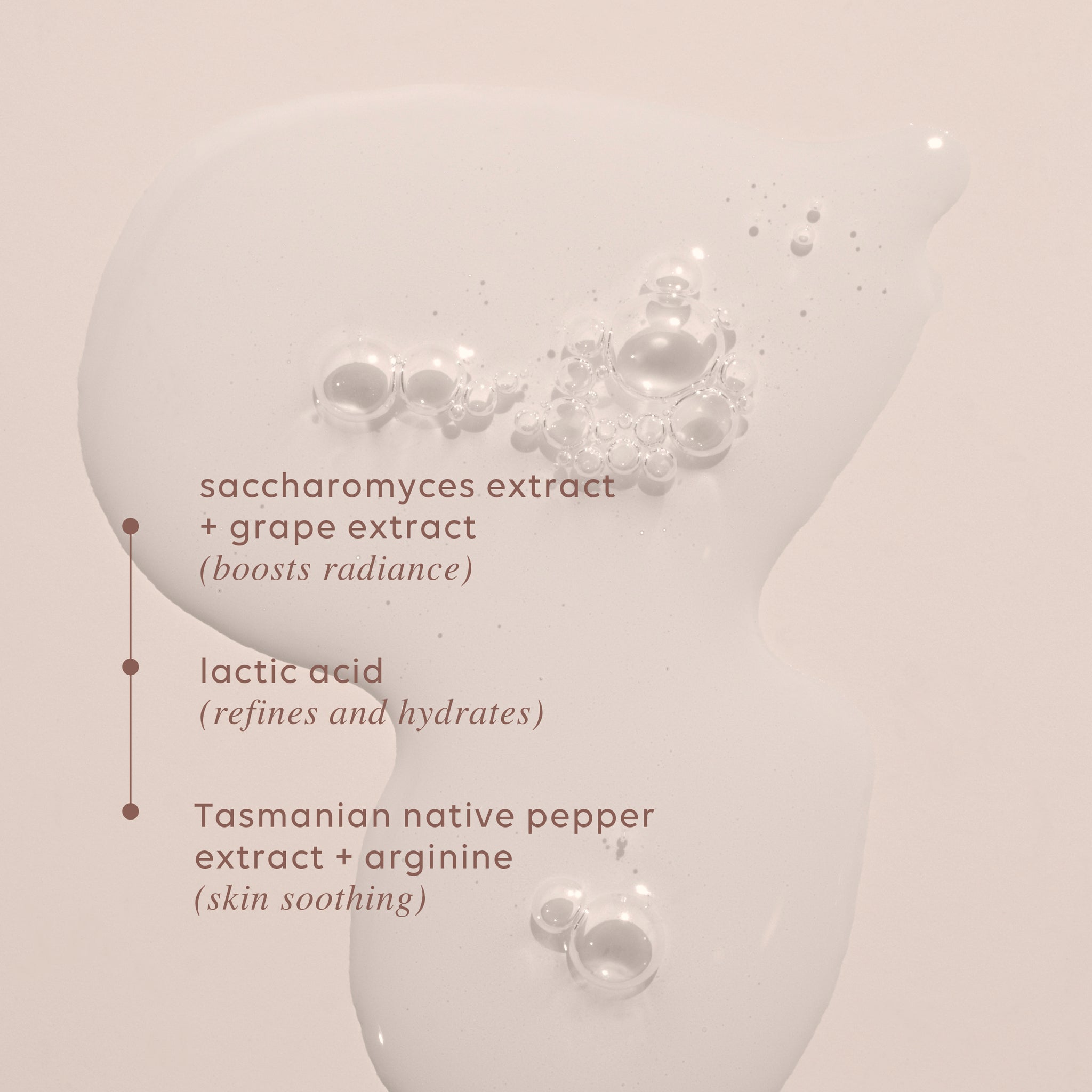 This formula features Saccharomyces and Grape Extracts to boost radiance, Lactic Acid to refine and hydrate, and Tasmanian Pepper and Arginine to soothe and calm the skin.