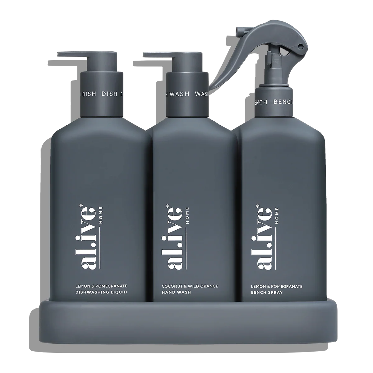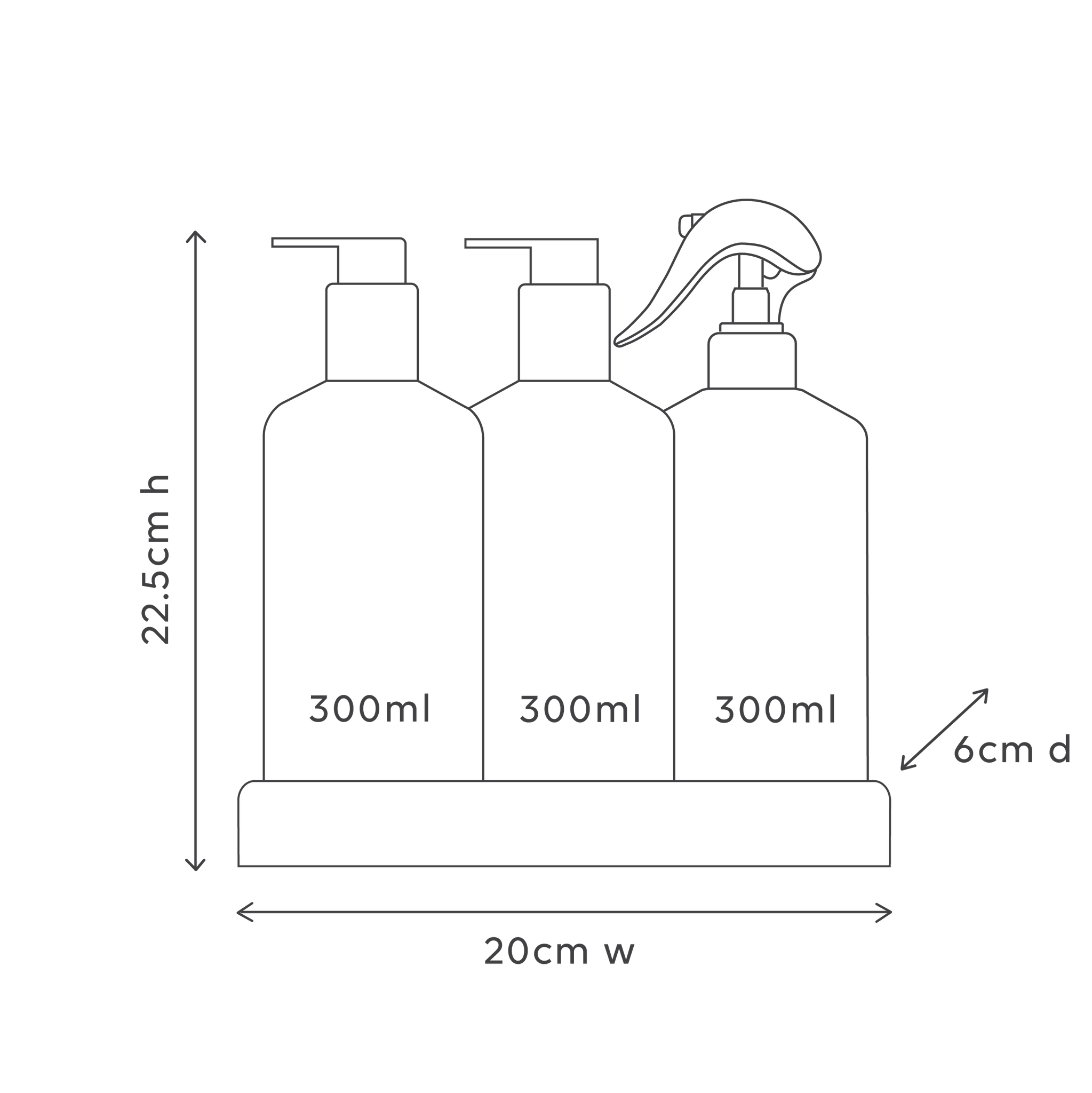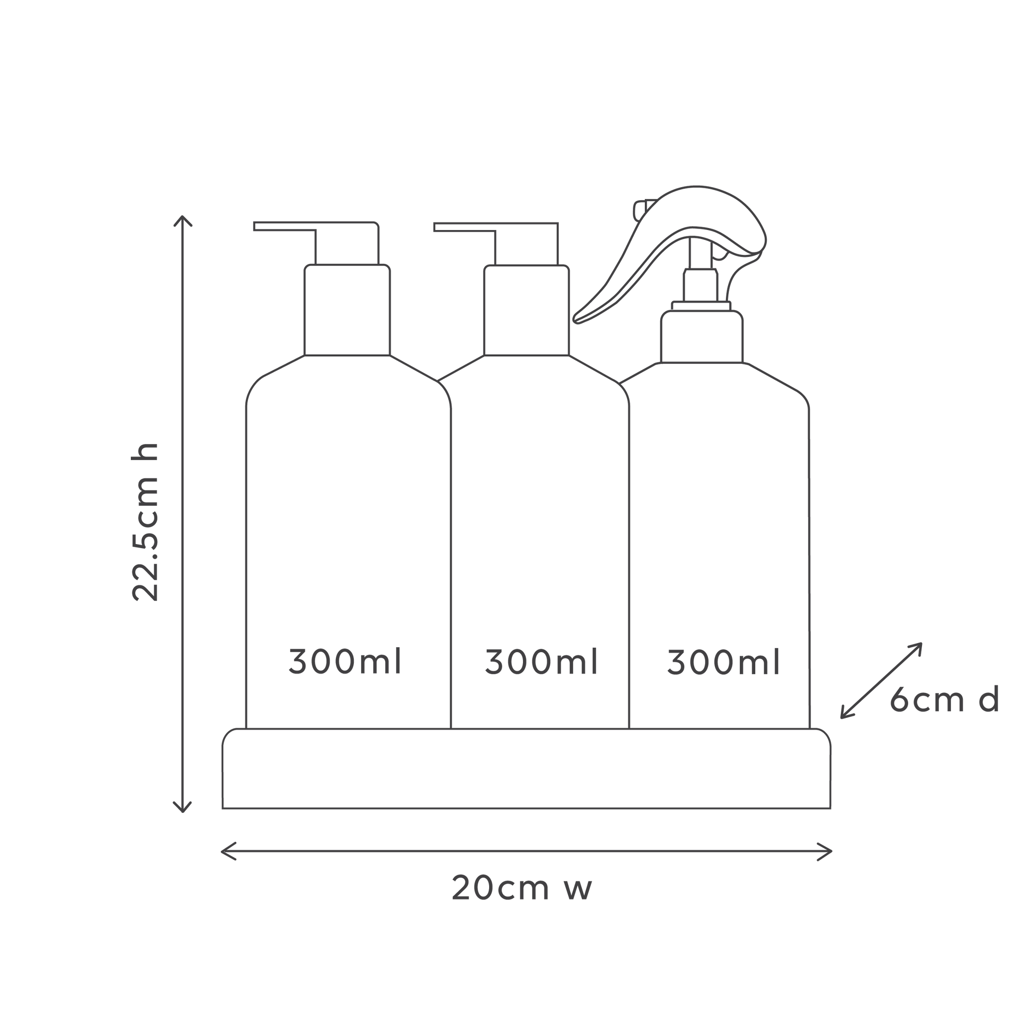 Presented in our 300ml interlocking bottles with a matching tray, this trio delivers functional performance without compromising on style. The rich colourway enhances any interior aesthetic and creates a coordinated, elevated display on your kitchen bench.